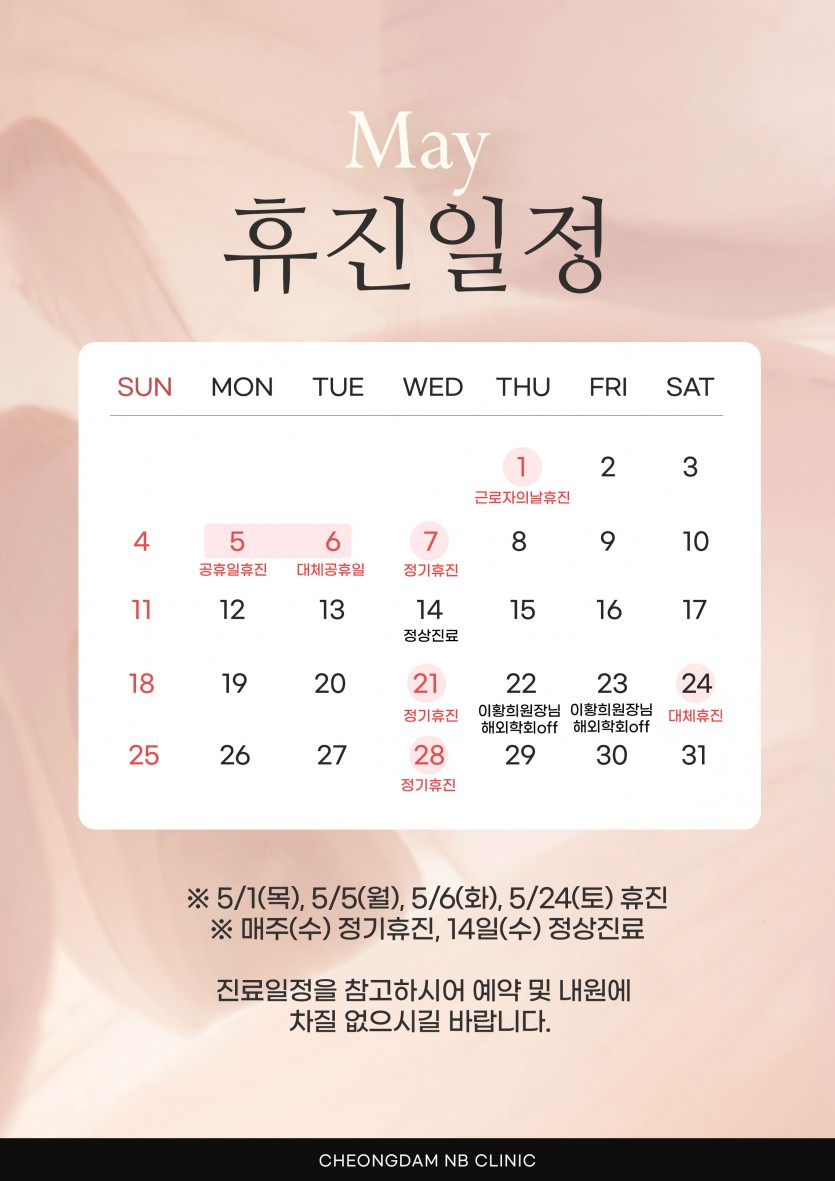 5월 진료/휴진 안내 2025-04-04 본문 ※ 5/1(목) 근로자의날 휴진 ※ 5/5(월) 공휴일 휴진 ※ 5/6(화) 대체공휴일 휴진 ※ 5/14(수) 정상진료 ※ 5/24(토) 병원 대체휴진 ▪ 5/22(목)~5/24(토) 이황희원장님 해외 학회로 휴진입니다. ▪ 박미소원장님 5/22(목), 5/23(금) 진료합니다. ▪ 조자미원장님 6/2(월) 부터 진료합니다. ▪ 진료일정을 참고하시어 예약 및 내원에 차질 없으시길 바랍니다. 이전글 다음글 목록